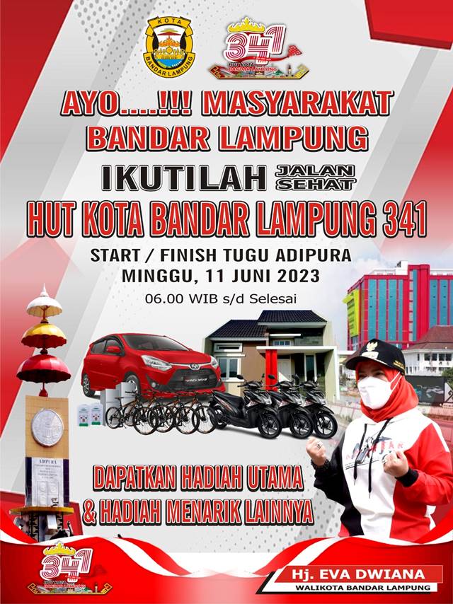 KANALLAMPUNG.COM — Dalam rangka HUT Kota Bandarlampung ke-341, Pemkot akan menggelar jalan sehat pada tanggal 11 Juni 2023 dengan hadiah utama satu unit rumah dan mobil Daihatsu Calya.